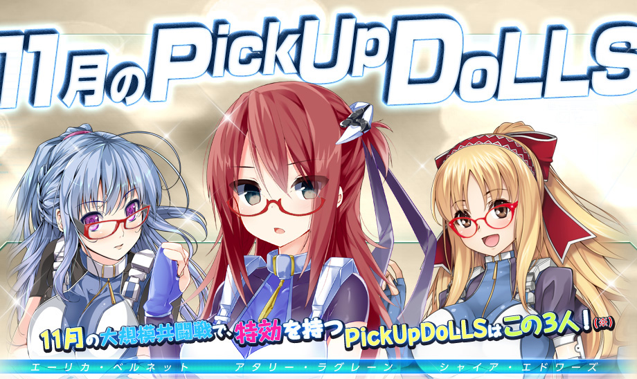 眼鏡三人娘 (11月のPick Up Dolls) 画像保管用 2013年11月17日 皆さんのURシャイアは順調に育っていますでしょうか? 攻撃510を超えたので、休息を2つ装備、片手スパンカーにして専用ボスへ これで スタドリS と スパンカー 不足ともお別れです 次は、636スナで1T撃破になる、攻撃637が目標値 さてさて、社内で依頼があったので、11月のPick Up Dollsに 眼鏡を着けました ほんと、それだけなんですけど・・・