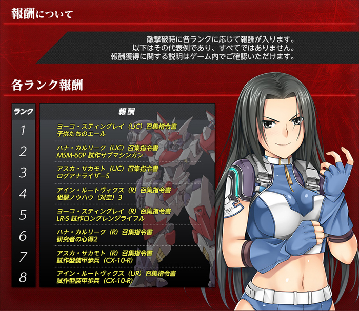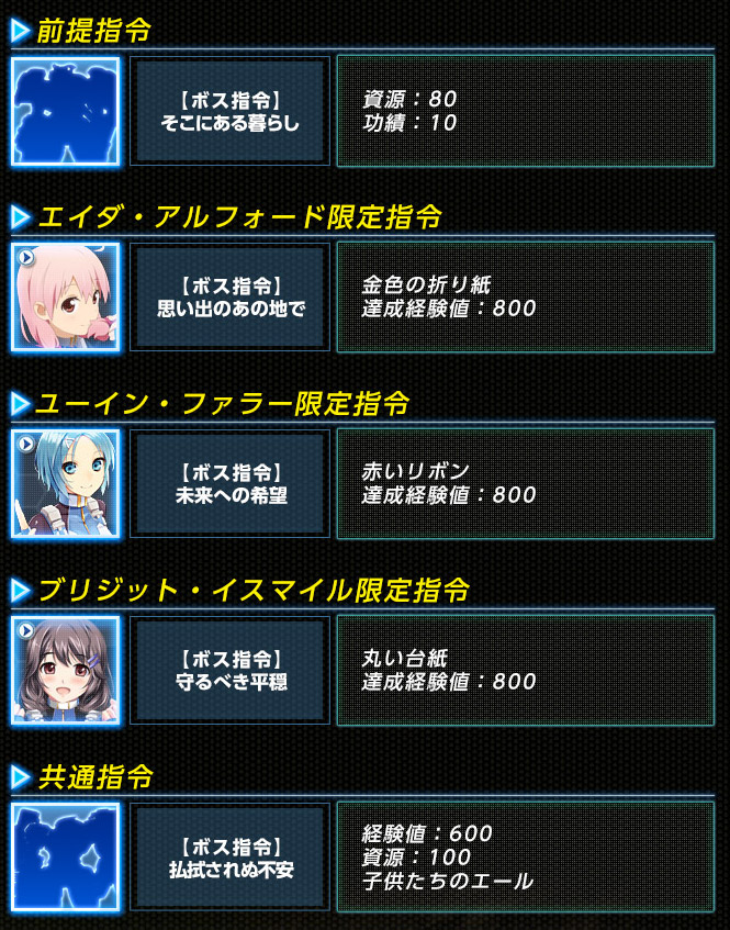 【ボス指令】脅かされる日常 イベント 2014年02月12日 今日のアップデートからボスが始まりました バレンタインのイベント的なのかな、これは・・・ 専用ボスでドロップするアイテムは、合成素材です 合体すると、「手作りの金メダル」というアイテムが出来ます ピンクアクセ (イベイド5、体力+5) 伍長 取引不可 売却可 うん、ゴミだ 共通指令でドロップする、「子供たちのエール」 HP(現在値)+100、疲労度-25% 取引不可 売却不可 ※注意 子供たちのエールは、HPが満タン か 疲労が0 の場合は使用できません しかも、売却も出来ないので、回収すると面倒です 疲労回復に使いたいときは、ストレングスパックを装備しましょう 共通指令 ボス耐久 HP60000 専用ボス ボス耐久 HP6000 耐久が下がっているので、後半戦は(゚∀゚)ウマウマ♪ になると思います 頑張って経験値を稼ぎましょう